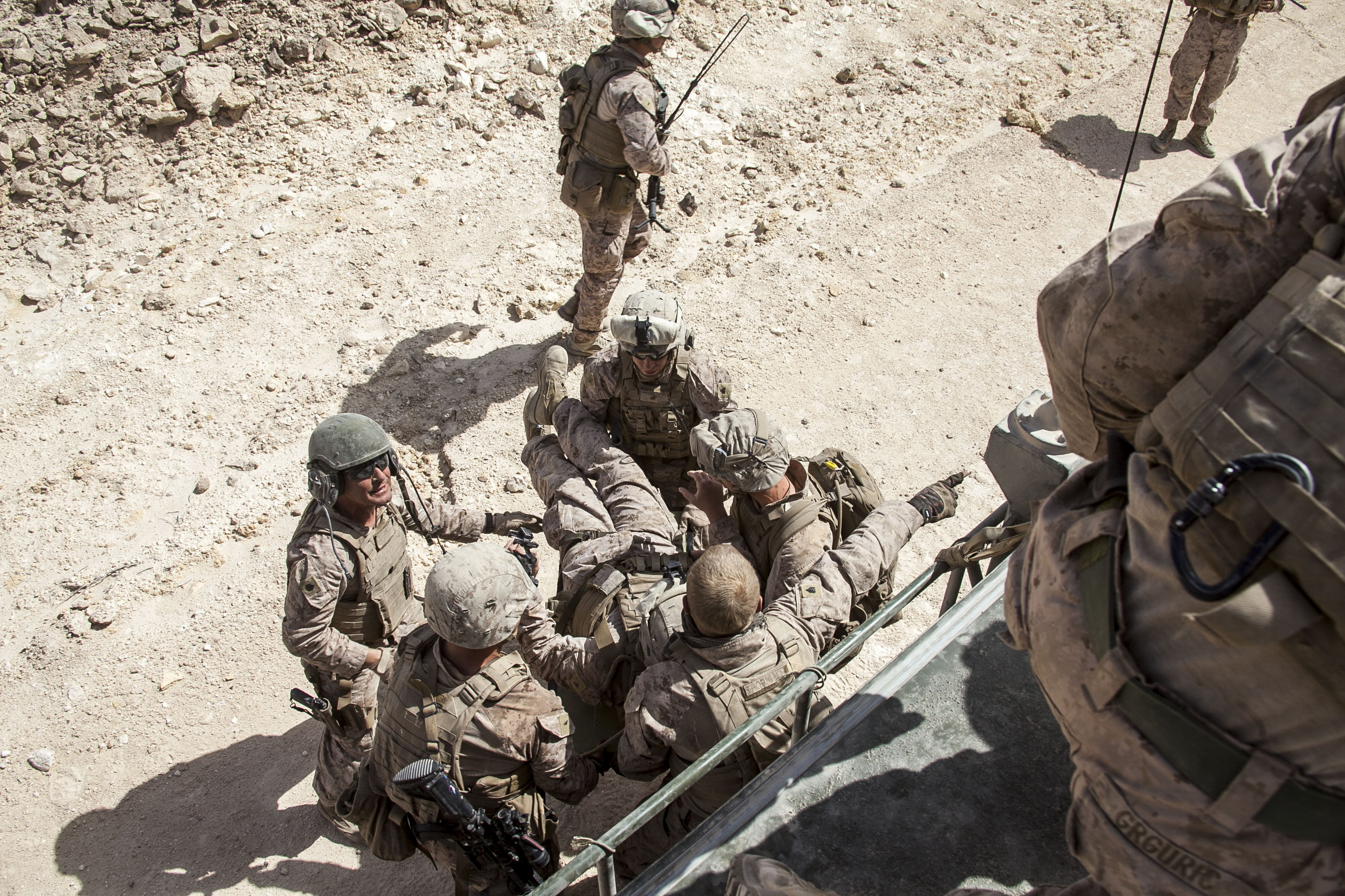 Amphibious Assault Vehicle (AAV) Platoon and 2nd Platoon, Company K, Battalion Landing Team 3/2, 26th Marine Expeditionary Unit (MEU), execute a personnel and vehicle casualty drill during an exercise in the 5th Fleet area of responsibility April 23, 2013. The 26th Marine Expeditionary Unit is currently deployed as part of the Kearsarge Amphibious Ready Group to the 5th Fleet area of responsibility. The 26th MEU operates continuously across the globe, providing the president and unified combatant commanders with a forward-deployed, sea-based quick reaction force. The MEU is a Marine Air-Ground Task Force capable of conducting amphibious operations, crisis response, and limited contingency operations. (U.S. Marine Corps photo by Staff Sgt. Edward Guevara/Released)